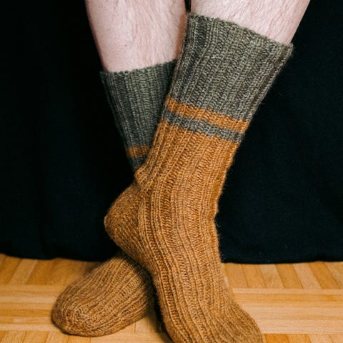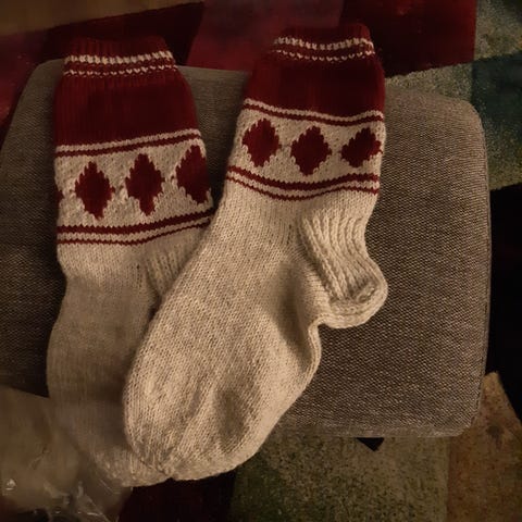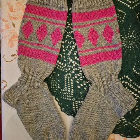 Itsekudotut upeat Jussi villasukat. Lankana Novitan Seitsemän veljestä, sininen ja Viking Garn Reflex, valkoharmaa langat. Pesu 30 C.