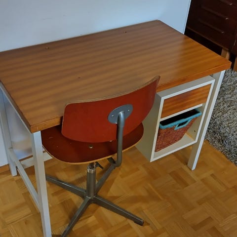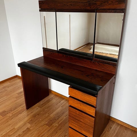Näppärä teak pintainen pikkupöytä,joka toimii niin kirjoituspöytänä kuin peilipöytänä.