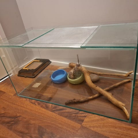 Pieni halkeama sivussa, ei ole haitannut käyttöä. Verkon kansi pysynyt magneeteilla kiinni, mutta vaatii niiden uudelleen liimausta. Toiminut nuoren viljakäärmeen kotina.