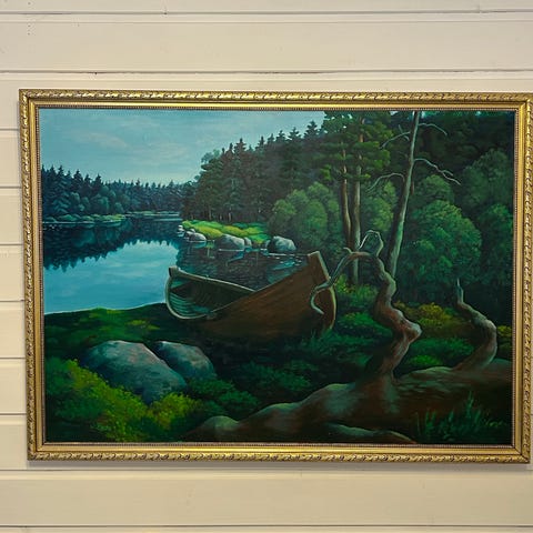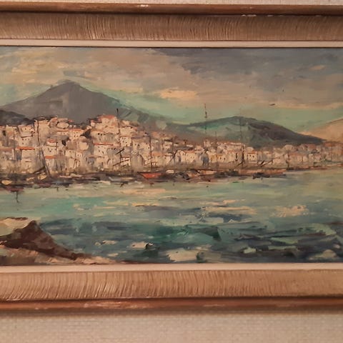 Öljyvärimaalaus, jossa on maisemakuva, kehystetty. Maalaus esittää vuoristoista maisemaa ja vesistöä, jossa on vihreitä vuoria ja sinistä vettä. Kehys on puinen ja vaalea.