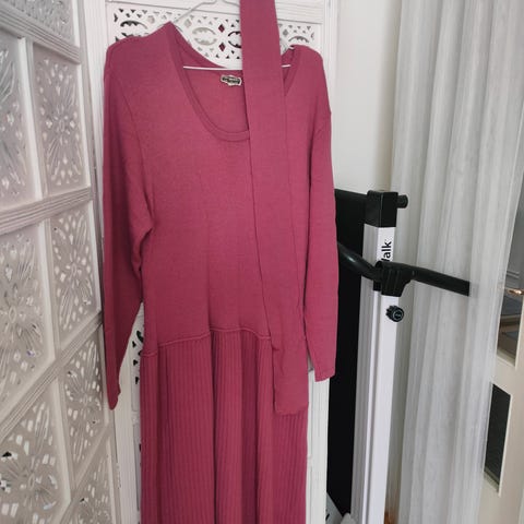 Puuvillasamettimekko. Olkatoppaukset. Alaspäin kapeneva malli. Mitat olalta helmaan125 cm.rinnan ympärys 108 cm. Vyötärön ympärys 104 cm. Lantion ympärys. 104 cm. Helman lev.97 cm. Takana ja hihansuissa halkio . Olan pit. 14 cm. Hihan pituus 61 cm.