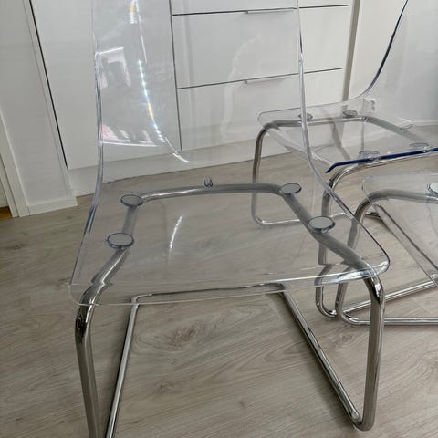 Myydään Ikean läpinäkyvä Tobias tuoli. Käytönjälkiä löytyy ainakin selkänojassa pieniä naarmuja sekä istuinosan ja selkänojan välissä kaksi jälkeä. Näkyvät jotenkin viimeisessä kuvassa. En ole yrittänyt putsailla sen enempää, voi olla että lähtevät oikealla puhdistuksella pois.