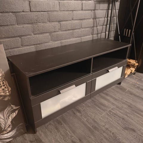 White IKEA BRIMNES TV unit with two pull-out drawers. Clean and practical, perfect for the living room. Like new in perfect condition, no visible signs of use. The white version is no longer available on IKEA’s website.