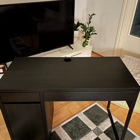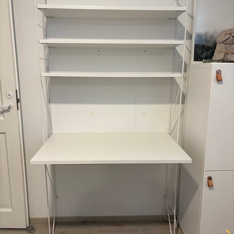 Myydään kuvan mukainen työpöytä-/hyllykokonaisuus. Hyllyjen paikkaa/korkeutta mahdollista muokata. Oikealta puolelta ylhäältä yhdestä kulmasta irronnut maalia n. 1cm x 1cm alueelta (kts. kuva).