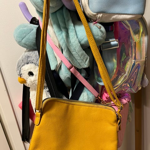 Sinapinkeltainen laukku, jossa irrotettava pitkä olkahihna.