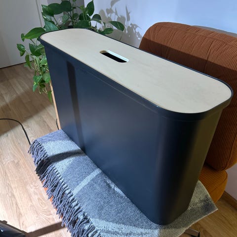 Erittäin hyväkuntoinen säilytyslaatikko tai kierrätyslaatikko. Tässä on säilytetty koiranruokaa (säkissä), mutta hajua on tarttunut laatikkoon. Eli parhaiten varmaan palvelisi koiranruuan säilytyksessä tai kierrätyslaatikkona.