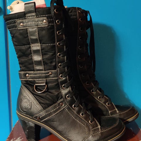 Pitkävartiset saapikkaat, vetoketjulla, nahkaa, ohut vuori, koristeet sivulla,korko n. 8cm