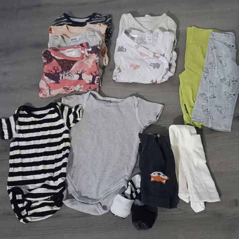 Vaatepaketti jossa suurinosa kokoja 62-68, muutama 74. 4kpl yöpukuja, 10kpl bodeja, 2kpl housuja, mekko, talvihaalari ja välihaalari. Kaikki ehjiä ja siistejä. Kahdessa bodyssa ja yhdessä yöpuvussa pientä mahdollista kellastumaa kaulalla. Osa tuotteista käyttämättömiä. Savuton ja eläimetön talous.