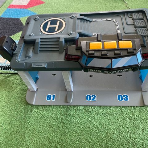 Hyväkuntoinen pelastusasema ja hälytysajoneuvot: paloauto, ambulanssi ja poliisiauto. Kolme valo- ja äänipainiketta (helikopteri ja kaksi sireeniä + englanninkielistä puhetta kaikissa) sekä hätäkeskuspuhelin, joka toistaa puheen kaiuttimesta hiljaisella.