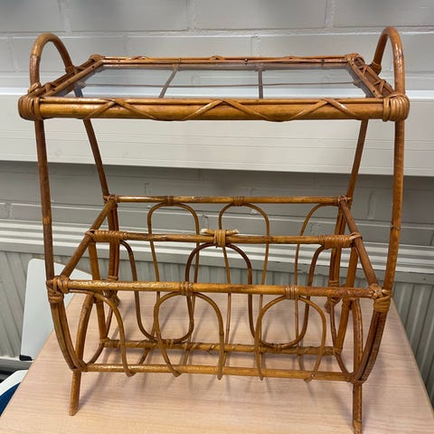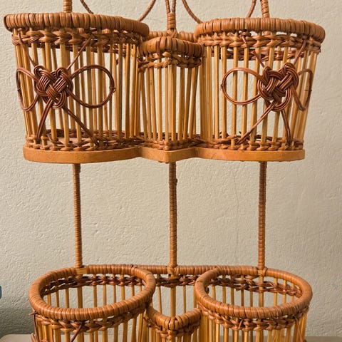 Erittäin hyväkuntoinen 50/60-luvun rottinki lehtiteline myytävänä. Punokset ehjät. Runko suora.
