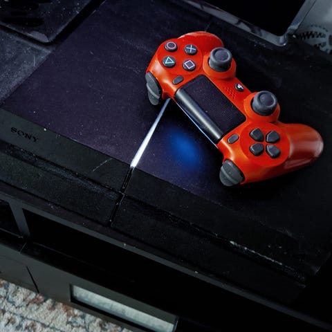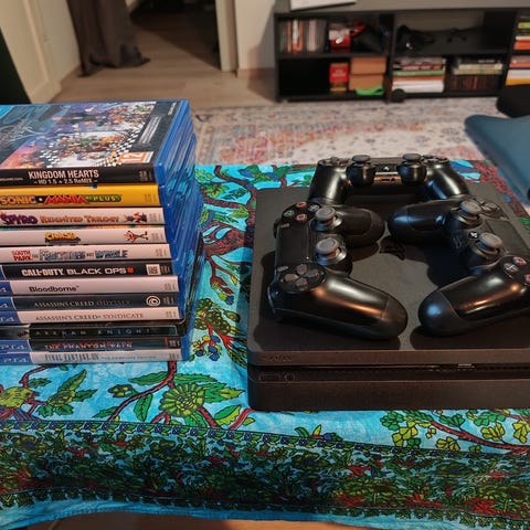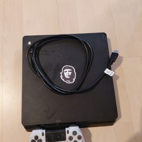 Myynnissä PlayStation 4 Slim 500 GB -konsoli. Pakettiin kuuluu: