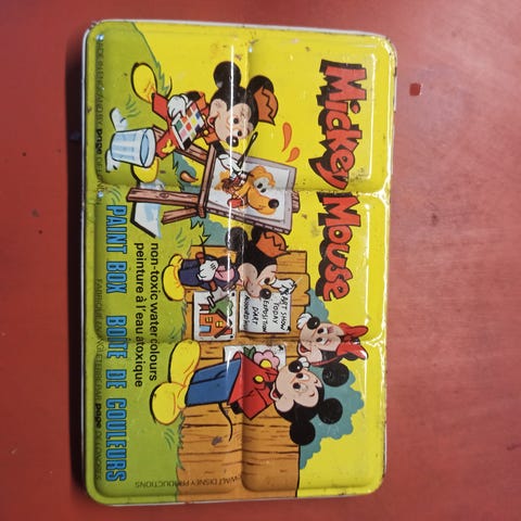 Myydään hyväkuntoinen metallinen Mickey säilytysrasia.