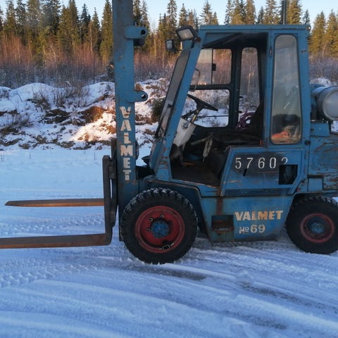 Hytillinen kaasutrukki, lumiketjuilla.