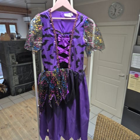 Musta noita naamiaisasu, joka sisältää pitkähihnaisen mekon ja noitaihatun. Mekko on valmistettu kevyestä ja läpikuultavasta materiaalista, jossa on koristeelliset yksityiskohdat hihoissa. Hattu on musta, kärpässieni-mallinen, jossa on hopeanvärinen hämähäkkikoriste.