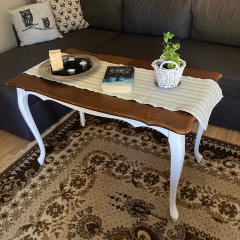 Pöydässä on ainakin kaksi eriväristä maalikerrosta. Pöytä on vanha ja pinnassa useita pieniä kauneusvirheitä. Mutta ollut meillä käytössä ja menee vielä hyvin esim mökillä.