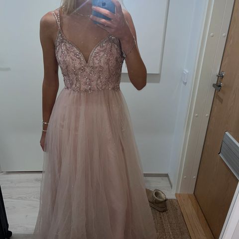 Grace Karin ihana vaaleanpunainen käyttämätön wanhojentanssimekko koko 32, mutta vastaa ehkä ennemmin kokoa 34-36. Virheetön, ei ole kertaakaan käytetty, oli lopulta hieman liian iso itselle. Sopii n. 170 cm pituiselle tanssijalle. 171-senttisellä ilman kenkiä helma osuu lattiaan. 3 kerrosta tylliä, alla 2 kerroksinen satiinikangas. Tyllihelman pituus sivusta mitattuna n. 105 cm, kainalosta asti mitattuna pituus n. 130 cm. Yläosassa paljon helmiä ja paljetteja sekä reilusti säätövaraa, takana nyöritys ja lisäksi alempana vetoketju. Oma vyötärönympärys tanssien aikaan n. 65 cm, jolloin kiristämisen varaa ei enää ollut. Suositellaan käytettäväksi helmaa kohottavan alushameen kanssa. Kulkeutuu myös lähiseuduille omien menojen mukaan. Alkuperäinen hinta 399€