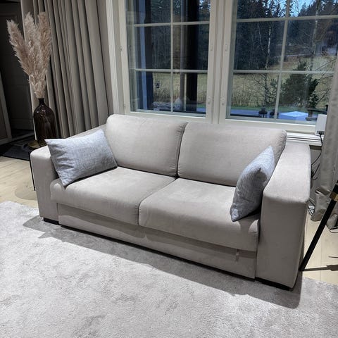 Valkoinen vuodesohva, noin 120 cm leveä levitettynä. Siisti ja ehjä, mutta saumoissa keinonahka antanut periksi, sohva on ostettu käytettynä ja nämä saumat eivät ole 5:ssä vuodessa muuttuneet miksikään, eikä näy jos ei erikseen katso saumoja (katso viimeinen kuva). Myydään tilanpuutteen takia. Mukava ja nätti sohva. Kuvassa olevat tyynyt ei myynnissä.