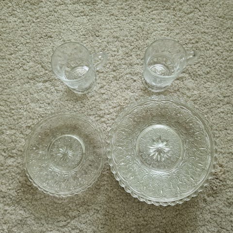Lautaset (2 kpl), jälkiruokakulhot (5 kpl) ja lasiset kahvikupit (4 kpl). Kuvasta poiketen osa kupeista ja lautasista jo myyty. Erillisinä kulhot 10e/kpl ja muut 5e/kpl. Kaikki kerralla edullisemmin, yhteensä vain 70e. Haku Tre keskustasta.