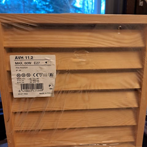Ehjä Ensto AVH 11 saunavalaisin mäntyritilällä. Mukana upotuskotelo. Kestävä valaisin sijoitettavaksi myös muuhun tilaan. Ritilän koko 25 x 25 x 7 cm. Valaisimen pohjan halkaisija 19 cm, korkeus 10,5 cm ja lasikuvun halkaisija 18 cm. Postitus mahdollinen.