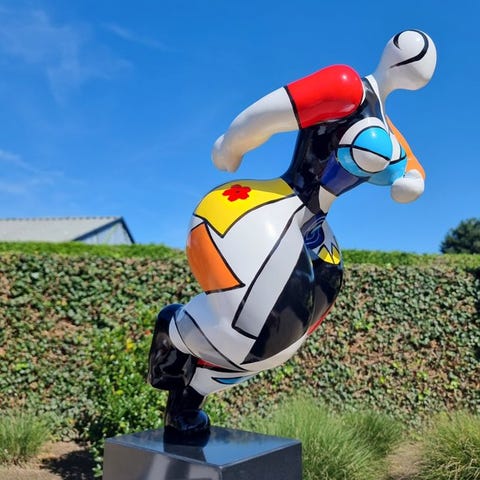 Kaunis, moderni ja värikäs taideteos seisovasta, tanssivasta naisesta. Tämä värikäs rintakuva on valmistettu lasikuidusta ja seisoo kauniilla kivijalustalla. Todellinen voimanpesä, jonka mitat (noin):