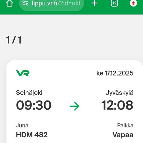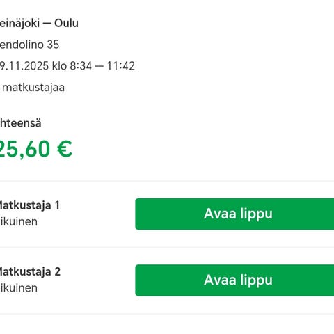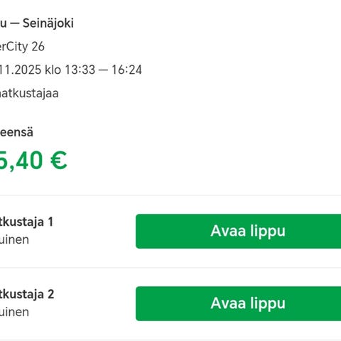 Aikuisen lippuja. Käy kaikkiin ko. välin juniin, joissa varatessa tilaa. Hinta per lippu. Maksu käy mobilepaylla.