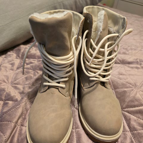 Teddyvuorelliset talvinilkkurit, koko 37. Leveä tolppakorko. Kunto hyvä, pidetty koitakin kertoja. Varren saa nostettua ylös tai pidettyä käännettynä.