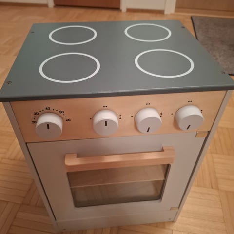 Puinen leikkiuuni pyörillä. Mukaan saa kuvassa näkyvät lisäosat. Siistissä kunnossa. Puisissa pyörissä kumipehmusteet. Korkeus 46cm ja leveys 24cm. Työntökahvan korkeus 40cm.