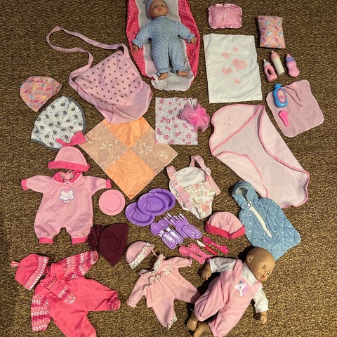 Myydään kuvan mukainen leikeissä olleita nukkeja ja vaatesetti. Kaikki osat olleet alkuperäisessä setissä mukana. Setti sisältää: