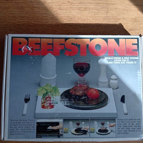 Käyttämätön, vuolukivinen Beefstone kypsennyskivi laatikossaan käyttö- ja reseptiohjeineen. 80- luvun laadukas, kotimainen tuote!