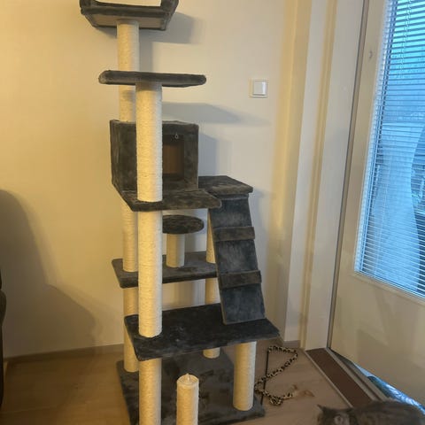 Kissan raapimispuu, jossa kolme tasoa ja harmaa pehmeä materiaali. Sisältää raapimiseen sopivat köysipylväät ja piilopaikan alhaalla. Soveltuu kissojen leikkiin ja lepohetkiin.