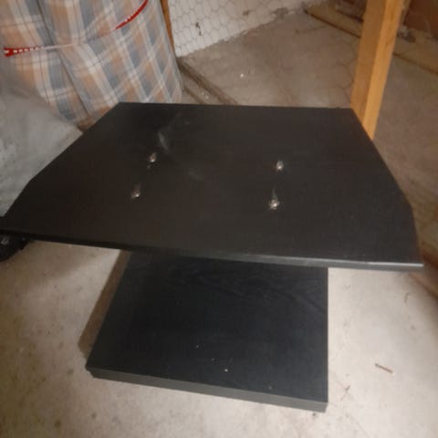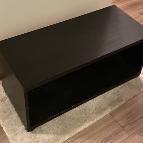 Tumma TV-taso, vähän hyllyissä naarmuja. Vähän heiluu kun kädellä heiluttaa, taustalevy tukisi, mutta en tiedä onko tässä sellaista koskaan ollut.