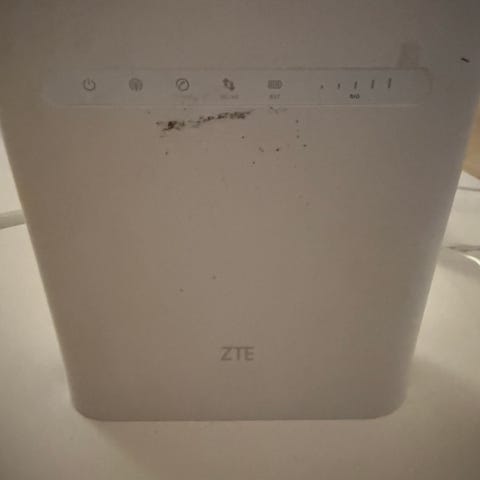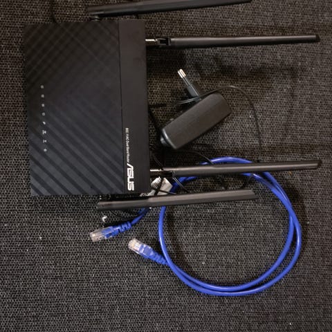 Valkoinen reititin, verkkolaite, jossa on useita tuuletusaukkoja ja virtajohto. Soveltuu kotiverkon tai pienen toimiston verkkoyhteyksien hallintaan.