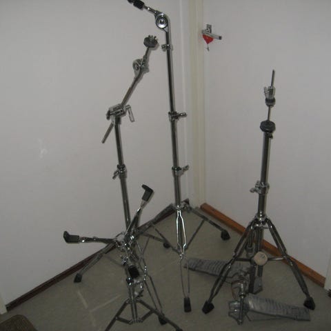 Kevyet telineet ja pedaalit basarille, virvelille ja hi-hat telineelle. Yht.30e