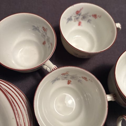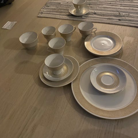 Arabia kahvikupit ja lautaset setti, jossa on neljä kupillista ja neljä lautasta. Posliinimateriaali, valkoinen väri ja kultainen koriste. Sopii kahvin tarjoiluun.