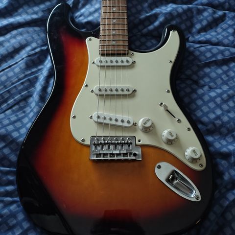 Sähkökitarat, jossa on ruskea ja musta väritys. Kitarassa on vaalea otelauta ja perinteinen muotoilu. Sopii erilaisiin musiikkityyleihin ja harjoitteluun.