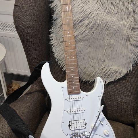 Uudenveroinen sähkökitara, viritin mukana sekä teline. Voin postittaa myös.
