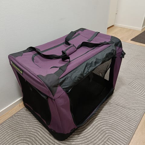 Peten Koiratarvike kangashäkki koirille värissä lila. Häkissä on verkolliset sivut ilmanvaihtoa ja näkyvyyttä varten. Materiaalina on kangas, ja häkki on suunniteltu sisäkäyttöön. Häkki on kevyt ja helposti kannettava, sopii koirien turvalliseen lepoon ja kuljetukseen kotona tai matkoilla.