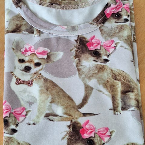 Myydään käyttämätön koirakuvioinen lasten t-paita, 146cm ja pipo.