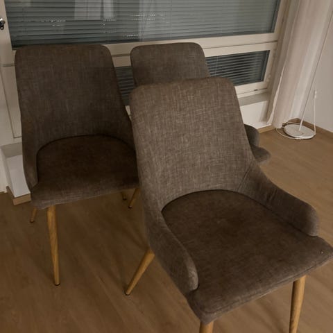 4 kappaletta ruokapöydän tuoleja. Tuolit hieman kiikkeriä (ollut pitkään käytössä) mutta kaikki osat tallessa. Annetaan ilmaiseksi. Nouto olarista.
