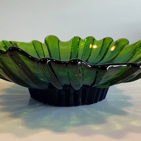 Humppilan Tauno Wirkkalan Tokka lasikulho. Alapuolella signeeraus Tauno Virkkala ja Humppila Finland.