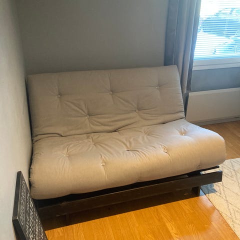 Vaalea, metallinen vuodesohva sekä vaaleanvihreä futon-patja.