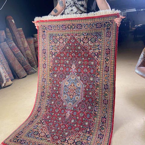 käsinsolmittu itämainen aitomatto villamatto vintage persialainen aito villabahtijaari punainen oranssi keltainen matto käsinkudottu käsin käsintehty käsityö antiikkimatto vintagematto helsinki helsingissä