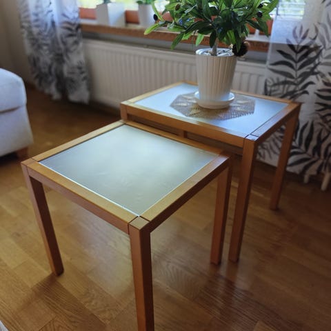 Lasipöytä ruskeat puiset jalat