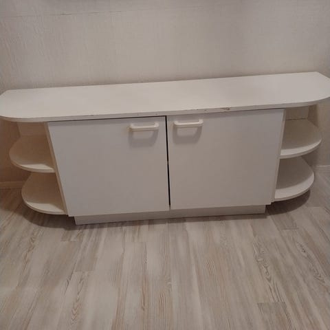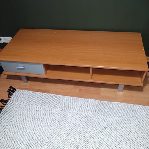 Vanha, puusepän valmistama viilupintainen taso, kolme lokeroa. Toisesta päästä viilut irti. Näkyy kuvassa. Irtopalat tallella