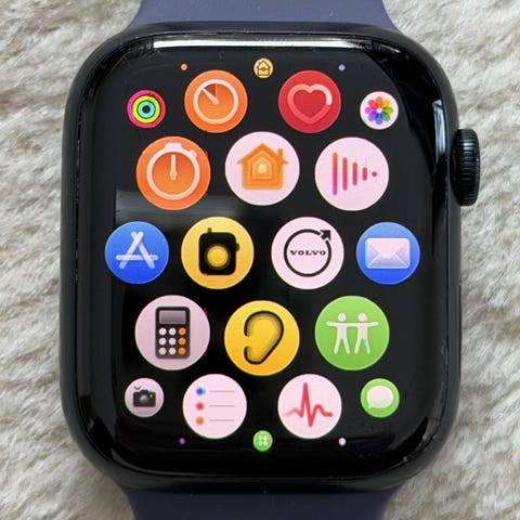 Apple Watch Series 7. Akun kunto 75%, pelittää koko päivän ellei käytä sykemittausta enempää kuin 1-2 tuntia. Ultran tilalta uuteen ranteeseen