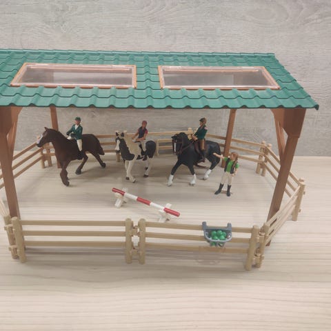 Oikein hyväkuntoinen Schleich setti joka sisältää ratsastaja Vilman, Lilli ponin ja ehjät poni varusteet