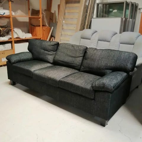 Hyväkuntoinen, siisti käytetty 3 istuttava sohva harmaalla kangasverhoillulla.