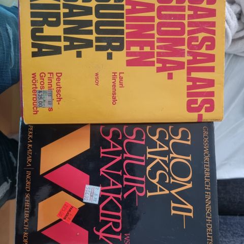 Paksu kovakantinen suomi-saksa-suomi suursanakirja. Kunto erinomainen. Myynnissä Lohjalla, mutta kulkeutuu ilman postimaksua Helsinkiin, Espoon Ikealle ja Espoon keskukseen. Myös postitus onnistuu. Myynnissä myös muualla. Hp. 20 euroa