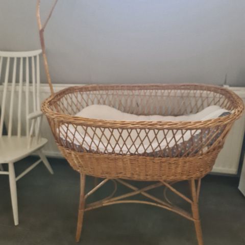 Myydään rottinko kehto, pyörillä kulkeva, sisältä verho katoksen, kaksi pientä lakanaa patjalle
