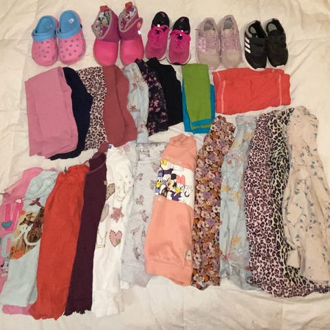 Pahvilaatikollinen sekalaisia tyttömäisiä vaatteita. Siisti käytetty kunto.